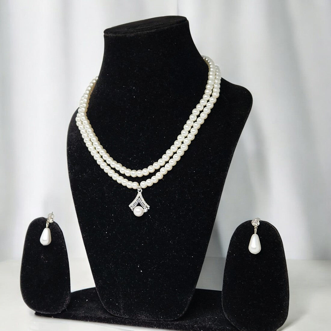 Enhance your elegance with this beautifully crafted Pearl Jewellery Set, designed to add timeless charm to your look. The set features a double-layered pearl necklace adorned with a delicate floral pendant at the center, paired with matching pearl drop earrings. The classic white pearls combined with a silver-tone finish make this set perfect for weddings, parties, festive occasions, and formal events. Lightweight and comfortable, this jewellery set effortlessly complements sarees, lehengas, gowns, and ethnic or Indo-western outfits.
